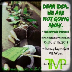 This is the second protest of the IDSA initiated this year by The Mayday Project. The first was a two-day event held on May 22nd and 23rd at the IDSA headquarters in Arlington, Virginia.