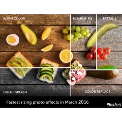 Fastest rising photo effects in March: Warm Color, Color Splash, Blemish Fix, Fattal 1 and Color Replace. And the most popular photo effects were Light Cross, HDR1, Blur, Dodger and Cinerama. High-res images of this graphic and others can be found here.