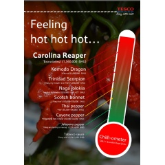 Tesco has become well known for its top of the heat range chilli peppers and over the last few years has stocked the Trinidad Scorpion, Bhut Jolokia and Bedfordshire Super Naga.