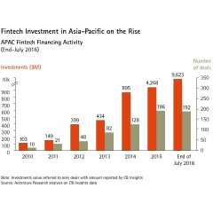 Investments in Asia-Pacific financial technology (fintech) ventures, primarily in China, reached $9.62 billion as of July 31, more than twice the $4.26 billion invested in the region in all of 2015, according to Accenture (NYSE: ACN) analysis of CB Insights data.