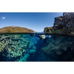 The rift is thousands of years old, created by the splitting apart of the Eurasian and North American tectonic plates. It continues to drift wider each year, by a few centimeters, so the contours of the fissure are always changing. Upon entering the pristine glacial water, which is naturally filtered through layers of lava to arrive at the fissure with near-perfect clarity and visibility, snorkelers and divers enter a universe unto itself. Blue and green algae, black rocks, and sunlight refracted rainbows will dazzle you as you swim between the walls of the continents like a bird soaring through a canyon.