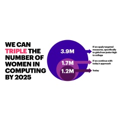 The share of women in the U.S. computing workforce will decline from 24 percent to 22 percent by 2025, according to new research from Accenture and Girls Who Code. But interventions to encourage girls to pursue a computer science education could triple the number of women in computing to 3.9 million, growing their share of technology jobs from 24 percent today to 39 percent in the same timeframe.