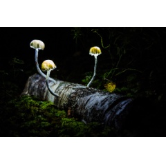 To that end, the artists set to work lighting up a forest realm called Dølerud, just outside of Oslo, with the use of advanced technology, many meters of electrical cable, generators, and an impressive number of LED diods (45,000 in all). By interweaving lights through the forest—along paths, over water, up and down tree trunks, even inside mushrooms—they mapped out the contours of the woodland terrain so that when night fell, instead of becoming a secreted space, obscured by shadows, it opened up and came alive.