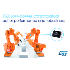Geneva, November 14, 2016 - STMicroelectronics has upgraded its 16V CMOS dual and quad analog comparators using the latest-generation process technology to achieve lower typical current consumption of 5µA per comparator, as well as faster propagation time and increased ESD capability of up to 4kV.