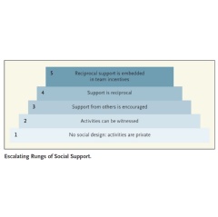 The authors define a ladder with escalating rungs of social support ranging from no social engagement – such as when a patient is expected to take medication as part of a routine, without anyone seeing them do it or holding them accountable – to a design that relies on reputational or economic incentives, and incorporates teams or other designs that hold patients accountable for their health behaviors and habits.