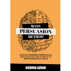 “Bushra Azhar has taken the black magic art of persuasion and turned it into a gleaming array of come-hither shining switches that are just begging to be pressed! As an author with a bestselling book on Amazon myself, I was fascinated (and a tiny bit amused) to see what kind of book Bushra would come up with. I admit it I was a bit snobbish. Her online stuff is amazing, but I wondered how her flamboyant style would work in a book. It works magnificently well! I’m happy to report that the book is packed with pertinent advice, heaps of examples, and the actual words to use to convert suspicious browsers to eager buyers who do not experience any remorse whatsoever. There is not a boring moment in the book, and my advice is to read carefully, and not get so busy laughing that you forget that this is a serious business book wrapped in a heady mixture of entertainment and “OMG now I get it” facepalm moments. I have used Bushra’s online advice to launch my own book and other enterprises, and I wish I had this book to do that! Bushra’s book will take you on a revealing journey, don’t miss it if you want your eyes opened on what works online. I’m waiting for the print book now. ‘Mass Persuasion Method’ deserves to sit on the desk of every entrepreneur/author, or anyone who wants to persuade anyone, including teenagers! On the other hand, hide it from your teenagers!”- Susan Jagannath
