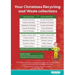 Residents who are due to have their bins collected on Monday 25 December will receive their collection two days earlier on Saturday 23 December. All other scheduled bin collections of recycling, food waste and refuse will take place a day later than usual and normal scheduled collections of these bins will resume from Monday 8 January 2018.