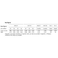 For the first nine months of 2017/18 (from 1 April to 31 December 2017), Alstom’s order intake reached €4.9 billion. The Group’s sales amounted to €5.5 billion, up 6% (6% organically) compared to the first nine months of 2016/17.