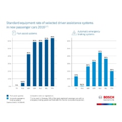 Driver assistance systems are increasingly fitted as standard equipmentParking assistance systems, emergency braking systems, and lane assist systems are also the most popular driver assistance systems in the U.K., the Netherlands, Belgium, and France – in that exact order. Parking assistance systems are even more widespread in France than they are in Germany: 67 percent of the new passenger cars registered there in 2016 provide their drivers with support while they park. Parking assistance systems are now included in the standard equipment of a vast majority of vehicles: at 63 percent of new cars, France has the highest proportion. In Germany, this figure is 42 percent. In Belgium and the Netherlands, 39 percent of new cars have an automatic emergency braking system – the highest proportion in Europe. Italy and Russia, which, alongside France, were included in the Bosch analysis for the first time, still have room to improve when it comes to driver assistance systems when compared with the other countries that were analyzed. However, 18 percent of new passenger cars registered in Italy in 2016 still had a lane assist system on board – and in Russia, they are getting the ball rolling with an installation rate of 6 percent. This is also true of automatic emergency braking systems, which also achieved a proportion of 6 percent in new passenger cars.