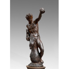 The statue, c. 30 cm high, features a naked young man who, with his outstretched hand, holds a globe as the symbol of the cosmos. That motif is an allusion to the name of the patron, Cosimo de’ Medici, who commissioned the piece.