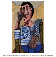 Adrien Meyer, Co-Chairman, Impressionist and Modern Art, Christie’s New York, remarked: “From the depth and power of expression to his striped Breton shirt, Le Marin is an extraordinarily vivid portrait of the artist. We are delighted to debut this remarkable image in Hong Kong, which is such an integral region to the burgeoning market for the artist. Painted at Picasso and western civilization’s lowest ebb in World War II, Le Marin is art history and 20th-century history writ large. That Le Marin once hung in the legendary collection of Victor and Sally Ganz, makes this picture all the more exceptional.”