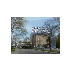 A cuboid structure with a side length of 22 meters will be built on top of the bunker, creating an area of around 1,000 square meters over two floors. This part of the building will be accessed via a stair tower and an elevator. The curtain wall is composed of organic shapes and features interesting visual interplay between light and shadow. The facade therefore reflects the concept of networking and the world of plastic materials.