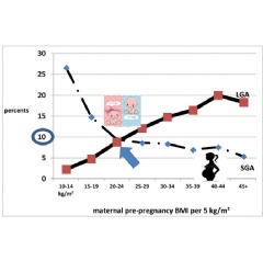 To test these claims, Dr. Robillard and the team carried out a 16.5-year observational study. They recorded the pre-pregnancy BMI, weight gain, and weight of the baby of 52,092 women who gave birth at full term. The first finding was that only women with a normal BMI had a balanced risk of having an SGA or LGA baby (both 10 percent risk); they call this crossing point the Maternal Fetal Corpulence Symbiosis (MFCS).