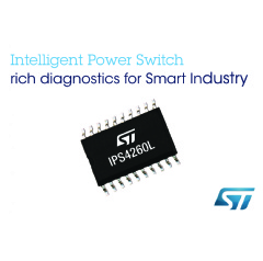 Geneva, May 23, 2018 -- The STMicroelectronics IPS4260L quad low-side intelligent power switch boosts efficiency and reliability in industrial automation, with four 260mΩTYP RDS(ON) power switches and protection features in a space-efficient, thermally enhanced package. The IC can manage up to 2.4A@TAMB=85°C (0.6A per channel or 2.4A on single channel) with the possibility to set current limitation threshold by external resistor and to parallelize the channel.