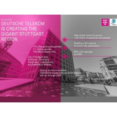 The region will become flagship of digitizationDr. Dirk Wössner, member of the Management Board at Deutsche Telekom responsible for business in Germany, said: "We are pleased that the Stuttgart Region has chosen to partner with Deutsche Telekom in building the high-speed network of the future. Together with the five surrounding districts, Stuttgart has one of the strongest, most innovative regional economies in Europe. A fast data network is the basic infrastructure for digitalization. We will put our shoulders to the wheel to make the Region a flagship and prove that their trust in us is not misplaced. We will shape the future of the Region together – and I’m looking forward to it" Wössner also emphasized: "We are a reliable partner when it comes to connecting nearly one-and-a-half million households and businesses to the fiber-optic network in the next few years. Deutsche Telekom is planning, building, and operating the networks of tomorrow, together with partners in some cases. Our partnership with the Stuttgart Region will be a shining example of how this can work. We’ll get started as soon as the contract is signed. We want to connect as many people, schools, and businesses as possible to the fiber-optic network as quickly as possible. The project has a long-term scope, but its short-term successes will be tangible to many. Month for month and year for year. We will be relying on the support of the 179 cities and municipalities in the Region when it comes to rapid execution on site. And we will open our fiber-optic network to third parties at fair market conditions. To accomplish this, we also need a legal framework that rewards investment and provides legal certainty: Regulation must not stand in the way of this innovative partnership model, the first of its kind in Germany"
