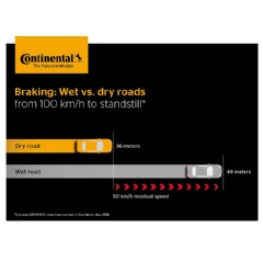 The braking distances from 100 km/h measured by Continental on dry and wet roads are 36 meters and 48 meters respectively. These apply to brand-new tires with maximum tread depth. In practice, experience shows that braking distances in the wet increase as tread depth decreases. The formation of a slippery film on the road surface, particularly after long dry spells, makes it even more difficult to predict how long the vehicle will actually take to stop. To stay safe in the wet, motorists are advised to reduce their speed and maintain sufficient distance from vehicles in front.