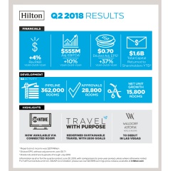 - Approved 28,800 new rooms for development during the second quarter, growing Hilton’s development pipeline to 362,000 rooms as of June 30, 2018, representing 9 percent growth from June 30, 2017
