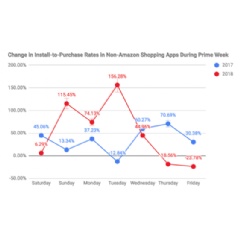 Across the entire week this year, the percentage of users who installed a non-Amazon shopping app and made a purchase increased by 46.18 percent when compared to the previous five week period, nearly identical to what we saw during Prime Week last year (a 46.76 percent lift). And again, as in 2017, Liftoff saw the percentage of new shopping app installs decrease during Prime Week by 6.42 percent, suggesting that while slightly fewer people installed shopping apps throughout the course of the week, those that did had a very high intent to purchase.