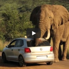 In one video, an elephant rubs an itch on a tourist’s VW.  In another, cheetahs hitch a ride on the front seat of a safari car. A safari guide’s soothing voice prevents a disaster when a rhino charges his group’s van in one of the most exciting videos in the collection. Others show lions taking over a disappointed safari group’s picnic, and a 2.5 ton giraffe charging a Jeep.
