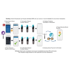 While lauded as one of the most private and secure types of currencies available, the majority of bitcoin transactions are all still routed using traditional Internet ‘broadcasts’ that travel through centralized carriers and ISPs that can censor or record metadata for every transaction. In the United States and Europe, these carriers and ISPs are consolidated to just a few major providers, who control consumer access to those services and do so sometimes at the peril of public safety. In other countries throughout the world, these networks are often state-controlled and subject to censorship, surveillance or even being shut off.