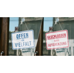 The full-page newspaper advertisement that was published in today’s Hessische Allgemeine (HNA) and Frankfurter Allgemeine Zeitung shows a large-scale image of the front and rear of a door sign we all know from retail stores to show their opening and closing times. The advertisement’s core idea is a play on words based on that image, using the terms “open” and “closed” to denote the times at which a store opens and closes, as well as a moral/social stance toward an issue – in this case toward diversity, exclusion and xenophobia.