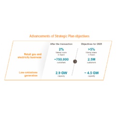 Investments in this area will total 2.5 billion euros between 2018 and 2020, including the 733 million euros allocated to this transaction. Repsol’s goal is to have 2.5 million retail gas and electricity customers in Spain by 2025, with a market share above 5% and a low-emissions generation capacity of approximately 4,500 MW.