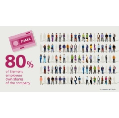 Today is "Share Day" in Germany, and Siemens is marking the occasion by highlighting its firmly anchored ownership culture: some 300,000 of the company’s 379,000 employees worldwide are also Siemens shareholders. This means that nearly 80 percent of all Siemens employees are simultaneously co-owners of their company. The number of employee shareholders at Siemens has remained constant since last year. No comparable company can point to such a high number of employee shareholders.