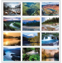 The U.S. Postal Service issues Wild and Scenic Rivers, stamps that pay tribute to the exceptional streams that run freely through America’s natural landscapes. This pane honors the rivers’ beauty with a dozen Forever stamps, each showcasing a different segment of the Wild and Scenic River System.