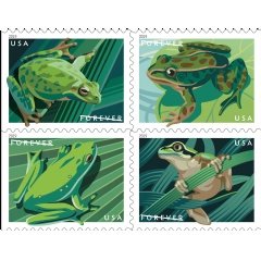 The U.S. Postal Service issues Frogs, four stamps in a booklet of 20 that feature digital illustrations of four North American frogs: the Pacific tree frog, the northern leopard frog, the American green tree frog and the squirrel tree frog. The First Day of Issue event is free and open to the public. News of the stamp is being shared with the hashtag #FrogStamps.