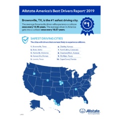 Brownsville, Texas, has the safest drivers in America for the second year in a row, according to the 2019 Allstate America’s Best Drivers Report®.[i]Released in advance of July Fourth, the deadliest day on U.S. roads[ii] according to the Insurance Institute for Highway Safety, the 15th annual report aims to start a national dialogue around the critical issue of roadway safety, celebrating the top-ranked cities’ drivers as an example for other communities.