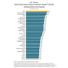 The study also includes a brand influence score (BIS) which measures familiarity and favorability of automotive brands among intended new-vehicle buyers in China. BMW achieves a BIS of 685 (on a 1,000-point scale), followed by SAIC Volkswagen (677) and FAW-Volkswagen (673).