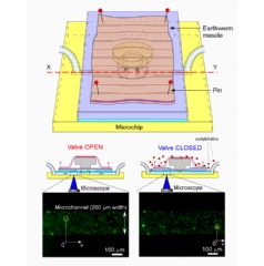 The team initially determined that a small 1 cm × 3 cm sheet of earthworm muscle could produce an average contractile force of about 1.5 milli-newtons over a 2-min period when stimulated by a very small amount of acetylcholine. Using this data, they build a microfluid channel and valve on a 2 cm × 2 cm microchip that could be controlled by the contraction/relaxation of earthworm muscle.