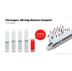 Deutsche Bahn (DB) continues to focus on growth and is progressively improving its quality and performance. Long distance patronage rose for the fifth time in a row in the first half of 2019: passenger numbers, which had already been high in the first half of 2018, increased by another 1.3% year on year. As of the end of June, a total of 71.8 million passengers – a new record – had used ICE and IC service. In all, DB expects to transport over 150 million long distance passengers in 2019, more than ever before in a single year.