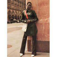 Designed to be versatile and timeless, the collection gives female power-dressing a game-changing makeover for a new era of confident women. The key pieces include the strong-shouldered Italian wool coat, the tailored wool suit with its nipped-in waist, tailored leather trousers, protective padded down nylon outerwear, elegant cotton and viscose blouses, bi-colour knee-high boots and fly-in-the-wind, recycled polyester dresses. A punchy colour palette of autumnal browns and mossy greens is offset by pops of tomato red and acidic yellow, alongside whimsical bespoke prints inspired by magnetic fields.