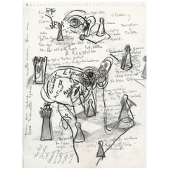 For her first monograph exhibition in Paris, the artist has transposed her interest in political strategy into a chess board: two complete chess sets have been placed either side of the glass-framed courtyard of the Beaux-Arts, pitting a group of soldiers against some demonstrators, and a gathering of thinkers against men and women politicians. The 64 pieces have been painted on paper, pressed onto wood and then suspended from the glass roof. Around them, tables and chairs have been provided for amateur or experienced chess players, Beaux-Arts students and professional players, who will come together for tournaments organized by the Paris Region Chess League for the duration of the exhibition.