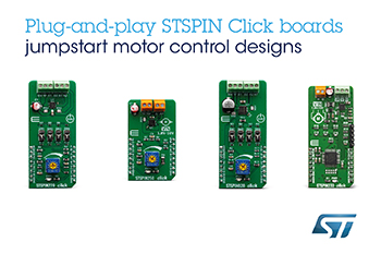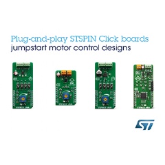 Geneva, October 10, 2019 -- STMicroelectronics has collaborated with MikroElektronika, an Authorized ST Partner, to create four Click boards™ that extend the advantages of STSPIN motor drivers beyond STM32-based designs to users of MikroElektronika prototyping boards, as well as other systems containing a mikroBUS™ socket.