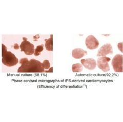 Hitachi automated the new 3D culture (low medium cost, low shear stress*8, and simple medium change process) by collaborating with Myoridge, solving problems of the previous 3D culture. The previous 3D culture has problems such as using a large amount of medium because of height of the culture reactor, the shear stress to cells from agitating medium, and the complex process of medium change. Hitachi started the collaborative research with Myoridge in October 2018 and developed the automation technology of the new 3D culture by distributing spheroids both uniformly and densely on the cell culture vessel for 2D culture. Furthermore Hitachi manufactured cardiomyocytes by the automation technology more effectively than by manual. The technology is probably able to be applied to a variety of cell types and make them to be manufactured automatically.