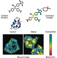 The folding state of the proteins in live cells often reflect the cell’s general health. Australian scientists have developed a molecular probe that senses the state of the proteome—the entire set of the proteins—by measuring the polarity of the protein environment. The fluorescence signal of the probe quantifies unfolding and its chameleon-like color shift maps the cellular regions of enhanced misfolding, says the study published in the journal Angewandte Chemie.