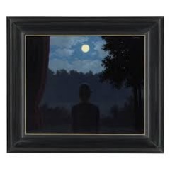 At its centre stands one of Magritte’s most familiar and enigmatic characters, the solitary man in the bowler hat, who appears lost in thought as he gazes upon the landscape before him. The bright glow of the moon casts a subtle sheen on the dome of his hat, while a soft, creeping mist hangs in the middle-distance, blurring the boundary between the forest and the open field. Seen from behind, the gentleman seems captivated by the vista, his stance and positioning amidst the sublime beauty of the natural world calling to mind the compositions of Caspar David Friedrich, although Magritte was no Romantic. There is a palpable sense of mystery and poetry to the scene, an uncertainty as to whether or not the view is real or imagined, and what exactly this figure’s role or place is in the world that the artist conjures.