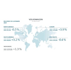 Despite shrinking overall markets, the Volkswagen Group grew its worldwide deliveries by 1.3 percent to 10,974,600 vehicles in 2019. Market shares were expanded in all regions, in some cases significantly. Volume growth was achieved in Europe (+3.9 percent) and South America (+3.2 percent) while there were slight falls in North America (-0.5 percent) and Asia-Pacific (-0.4 percent). Strong growth was recorded with electric vehicles. As a result of many new models within the framework of the Group’s electric offensive and growing interest on the part of customers, there was a rise of around 80 percent to more than 140,000 vehicles.