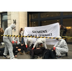 Wearing forensic suits and red gloves, ‘police officers’ have created a police cordon around the entrance to the building while ‘victims’ dressed in black are lying on the ground. A banner has been dropped from a window in the building saying ‘Climate Change Kills Children’ while another bears the words ‘Siemens = Climate Criminals’.