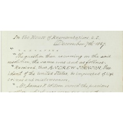 Original engrossed copy of the first impeachment resolution vote of President Andrew Johnson in the House of Representatives, signed by all 57 "Yea" votes,