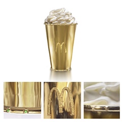 Valued at nearly $100,000*, the Golden Shamrock Shake is a hand-crafted, luxurious cup made with high-polish 18K gold and precious stones, designed to perfectly hold minty-green, Shamrock Shake deliciousness. The dazzling details include 50 green emeralds and white diamonds — representing 50 years of Shamrock Shake flavor and delicious whipped topping — as well as 50 yellow diamonds in each of the Golden Arches for 50 years of being a fan fave at McDonald’s.