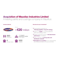 AkzoNobel has completed the acquisition of 100% of the shares of Mauvilac Industries Limited, a leading paints and coatings company in Mauritius. The transaction includes a local production facility, four concept stores and access to a strong distribution network.