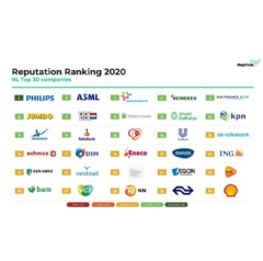 The RepTrak research surveys the 30 largest companies in the Netherlands, based on reported revenues. Their model assesses how companies perform on emotional and rational aspects of reputation, and how that translates into behavior, such as a willingness to buy products, work for, or invest in the company.