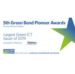 The Climate Bonds Initiative, a non-profit organisation that promotes large-scale investment for a low-carbon economy, has awarded Telefónica the prize for the Largest Green ICT issuer of 2019. This award is part of the 5th edition of the Green Bond Pioneer Awards.