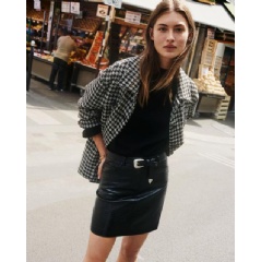 The designs for women in this collection evoke an urban ambience, with outfits with a very casual style, although with a sophisticated air. Everyday staples such as jeans, mono-tone t-shirts and sweaters combine with more elegant items such as suit jackets, mini-skirts and t-shirts, creating combinations that are perfect for the city. Other elements that add a special touch include the prints, such as check and houndstooth, and the fabrics, with faux-leather in trousers and jackets. The star colours are red, black and white, which frequently appear alongside denim garments, which are key to defining the silhouettes and highlighting the union between casual and elegant style. Key accessories include practical shoulder bags and comfortable shoes such as moccasins and flat military or cowboy boots.