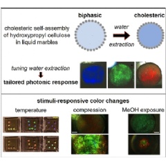 In this case, the scientists prepared liquid marbles from an aqueous solution of hydroxypropyl cellulose—a modified cellulose polymer that orients itself in cholesteric phases—coated by silica nanoparticles. These cellulose-based liquid marbles were colorless at first, but allowing them to stay for some time in a defined volume of an organic solvent slowly brought about bright colors of red, green, and blue.