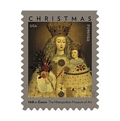 This Christmas stamp features a detail of “Our Lady of Guápulo.” Painted in the 18th century by an unknown artist in Cuzco, Peru, “Our Lady of Guápulo” is from the collection of the Metropolitan Museum of Art in New York.