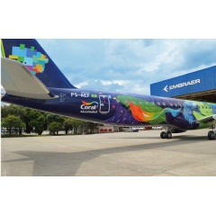 Brazilian artist Pardal created a design that pays tribute to the blue macaw and the protection of biodiversity. Of its incredible 58 colors, half are custom and had to be mixed in only two weeks. The Embraer paint team in Săo Paulo then applied AkzoNobel’s Aerodur 3001/3002 basecoat clearcoat system to bring the artwork to life.